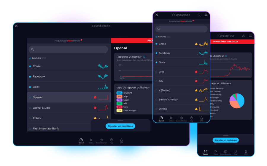 Surveillez et signalez les problèmes liés à vos services préférés en temps réel à l'aide de Downdetector, la plate-forme la plus populaire au monde pour suivre les pannes et les problèmes de connectivité.